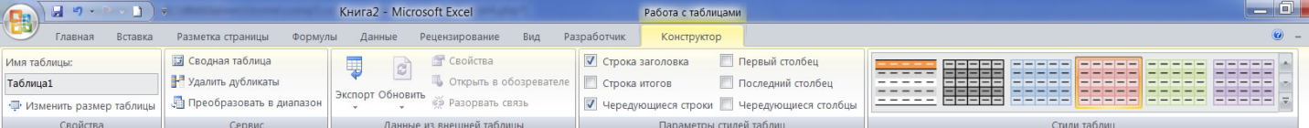 Оформление, структуры и прочие параметры таблицы изменяются с помощью раздела «Конструктор» (крайний справа). Она активируется, когда вы выделяете поле внутри таблицы.
