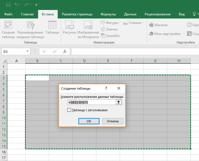 Есть еще один способ добавить таблицу. Перейдите в раздел «Вставка». Кликните по «Таблица». Откроется диалоговое окно. В нем можно задать диапазон (самая левая точка, самая верхняя, затем – крайняя правая и крайняя нижняя) и включить либо отключить заголовки.