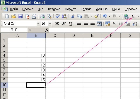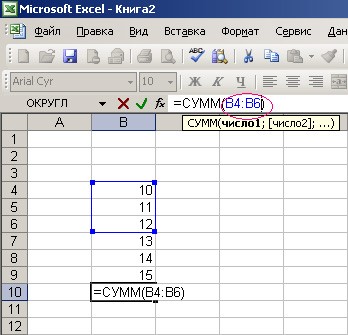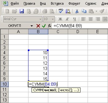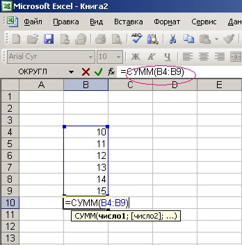 Область, в которой значения будут суммироваться, выделяется, а в ячейке суммы будет виден диапазон ячеек, которые просуммируются. Если это нужный нам диапазон, нажимаем клавишу «Enter», если нет, то мы можем изменять этот диапазон (например В4:В9 можно изменить на В4:В6).