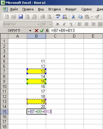 Курсор размещаем на ту ячейку, где должна находиться сумма выделенных ячеек. Нажимаем «=» (равно), кликаем на первую, выделенную желтым, ячейку, после чего в ячейке суммы будет сформирована формула. После этого кликаем «+» (плюс), за ним нажимаем на следующую выделенную желтым ячейку, опять «+», после чего жмем на последнюю, выделенную желтым, ячейку. После этого на экране появится: