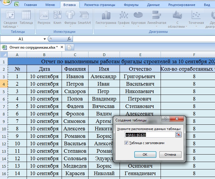 Такой же функционал по созданию умных таблиц представлен в подменю «Таблица» в меню – «Вставка». Выбрав это меню, вы снова увидите похожее диалоговое окно с прописанным диапазоном ячеек. Как и в предыдущем методе, здесь также стоит обратить внимание на графу – «Таблица с заголовками», не забыв проставить там галочку.
