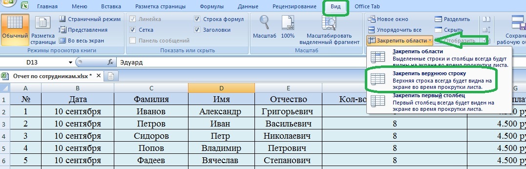 В зависимости от сложности шапки, варианты ее закрепления могут отличаться. Если шапка состоит из одной строки, то достаточно будет пройти во вкладку «Вид». Далее в меню – «Закрепить области» необходимо выбрать — «Закрепить верхнюю строку», как показано на рисунке.