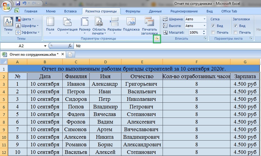 Для закрепления шапки на каждой странице таблицы необходимо пройти в меню «Разметка страницы» и выбрать иконку со стрелочкой в подменю «Параметры страницы».