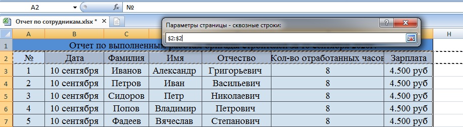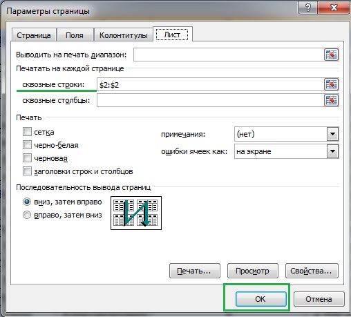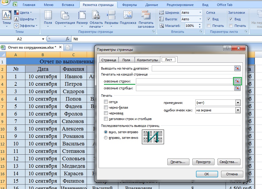 В открывающемся окне параметров страницы на вкладке «Лист» необходимо указать «Сквозные строки».