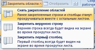 Чтобы открепить шапку, необходимо выбрать функцию – «Снять закрепление областей» в меню «Закрепить области», как показано на рисунке.