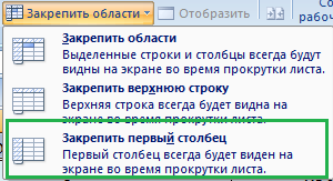 Примечание: помимо закрепленной шапки, программа Excel делает возможным закреплять первый столбец. Это очень удобно, если в вашей таблице горизонтальная ориентация, а не классическая вертикальная.