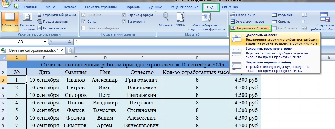 Затем следует зайти в меню «Вид», выбрать функцию «Закрепить области» и выбрать – «Закрепить области».