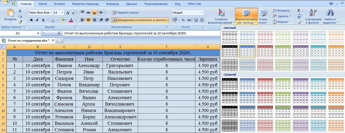 Не все таблицы могут начинаться с шапки. В некоторых случаях, пользователи прописывают в верхней части таблицы дополнительные данные, примечания, заметки и только потом идет описание ячеек. В таких случаях может пригодиться подменю «Форматировать как таблицы», которое расположено в меню «Главное».