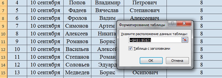 Здесь следует выбрать любой понравившийся стиль, после чего открывается окно – «Форматирование таблицы». В нем указан диапазон выбранных ячеек. В нашем случае – это =$A$1:$G$21. Далее следует поставить галочку в графе – «Таблица с заголовками». Благодаря этой функции будет корректно настроена шапка таблицы.